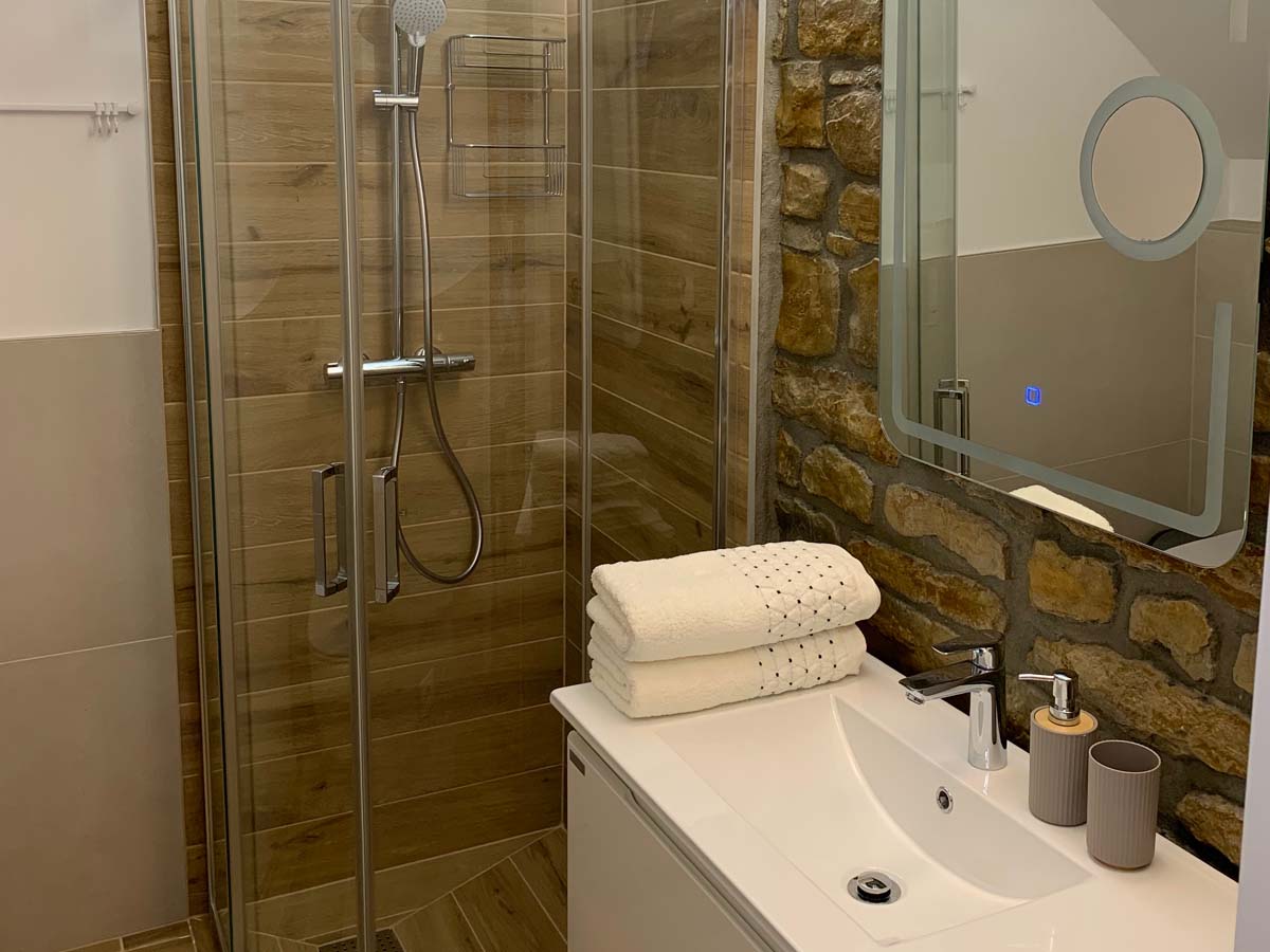 Koupelna se sprchovým koutem je vybavena ručníky, mýdlem, fénem.
